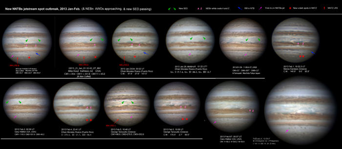 Indeed, there is a chain of at least 6 tiny dark spots moving with the NNTBs jet-stream. The leading spot has DL2 = -89 deg/month, typical of this jet-stream. A few tiny dark spots in the NNTBs latitude are also visible at other longitudes. 2) NEBn ovals interact: Observers have been keenly watching the two great white ovals on the NEBn, white spot A and white spot Z, as they approached each other. Now, they have begun to interact, as WSZ is more northerly than WSA. As with the encounter between WSA and WSB last Nov., and other such encounters in previous years [see our Report no.9, Appendix 2], the two ovals are expected to swing round each other and partially merge but to release a small slower-moving remnant as well. It would be informative to observe such a merger at even higher resolution and observers have the chance to do this now as WSA and WSZ are exceptionally large bright ovals. 3) A new SED is established: Last autumn I suspected that a new S. Equatorial Disturbance (SED) was developing, and at the New Year it seemed to be forming more distinctly, just after passing the GRS on Dec.27/28 [see our Report no.9, Appendix 4]. Indeed, it has remained a distinct feature with the familiar form of a SED since then, and will soon complete its first circuit of the planet as such, due to pass the GRS again around Feb.18. It is indicated in the attached set of images, and we expect to post a compilation soon showing its complete circuit of the planet. Congratulations to all observers, and best wishes for good observing conditions in the coming days and weeks. John