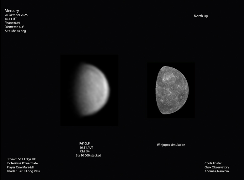 It is only over the last few days that I realised that Mercury is better placed than Mars, and I attempted a series of captures this afternoon despite the poor, windy conditions. Limited usable data.[Clyde Foster : Khomas,Namibia]