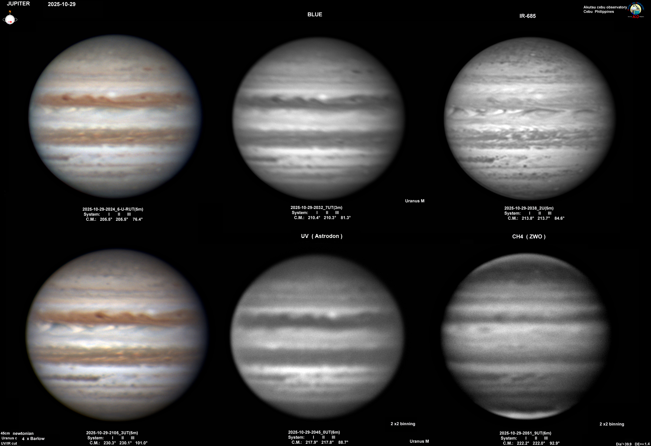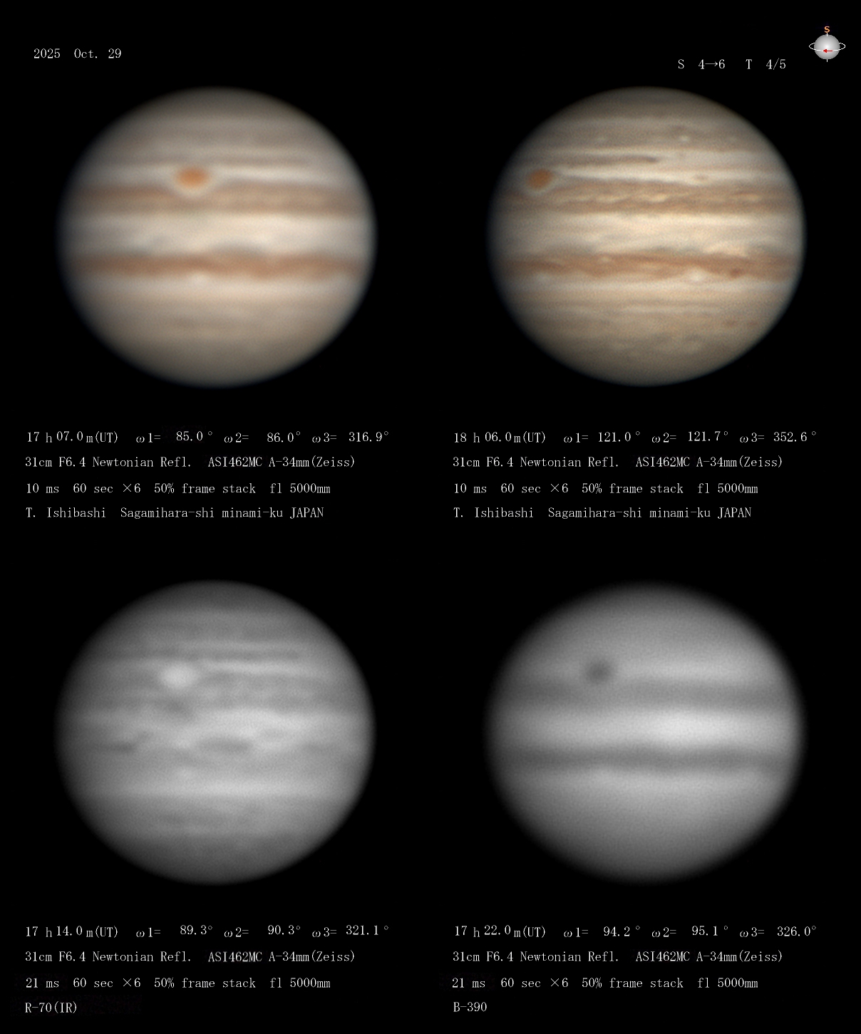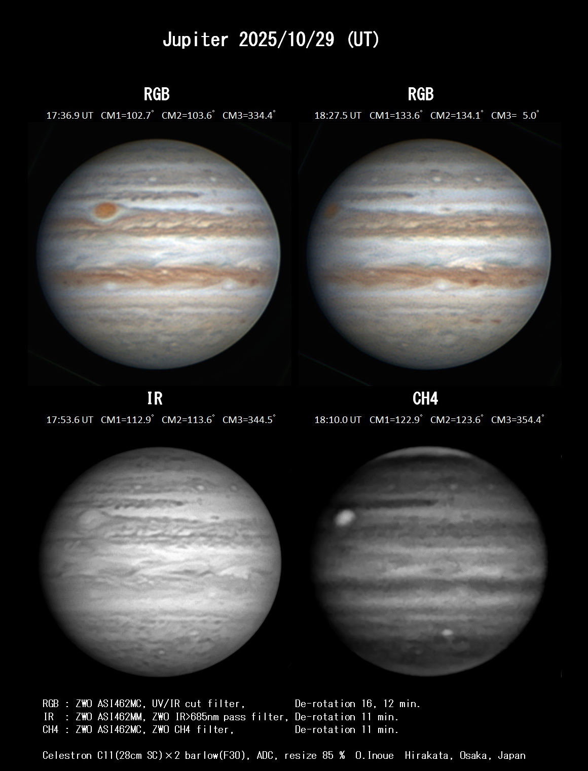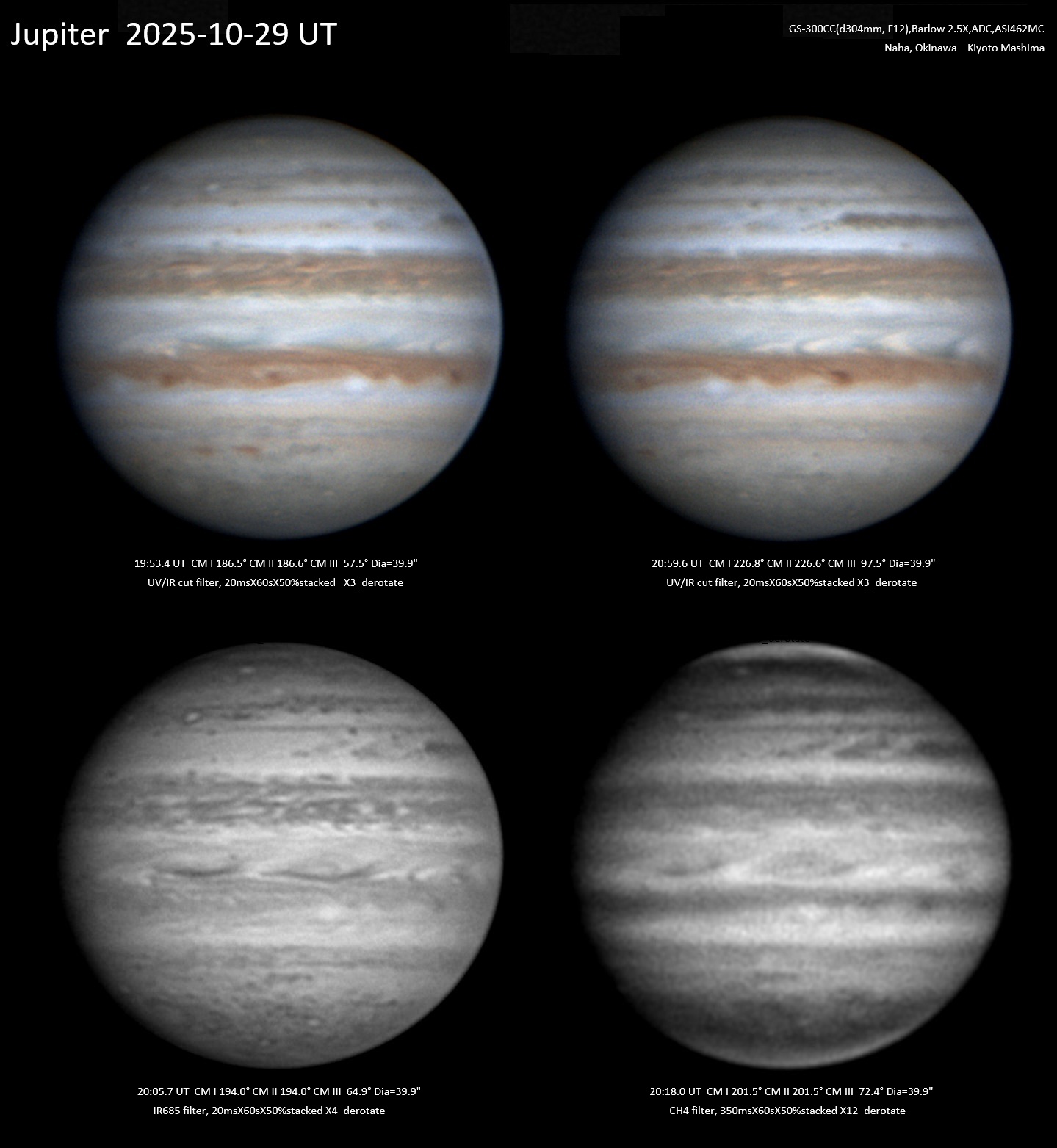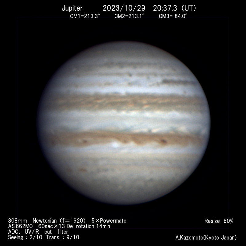 今朝は早朝晴れて木星が見えた。木星面ではSTB II=230°付近が明るくB光、UVでは明るい。Ch4でお少し明るい。