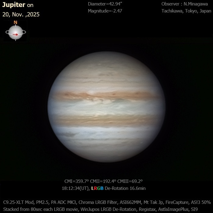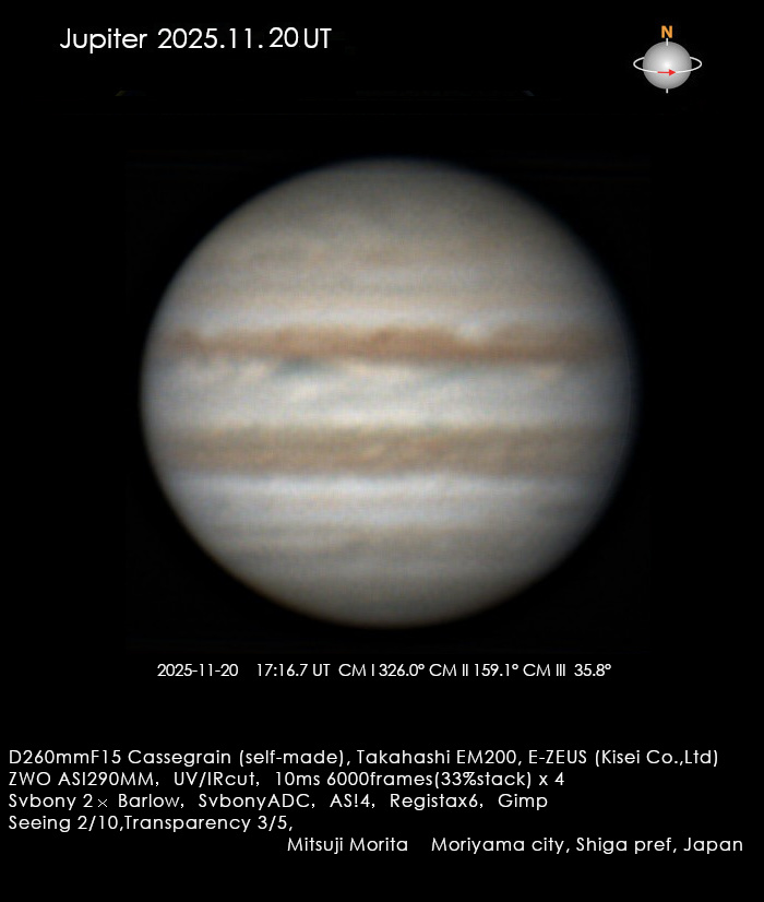 SEBの暗さが目を引きます。明るい白斑がひとつだけで、後方に伸びる明帯には暗柱も見られますが、