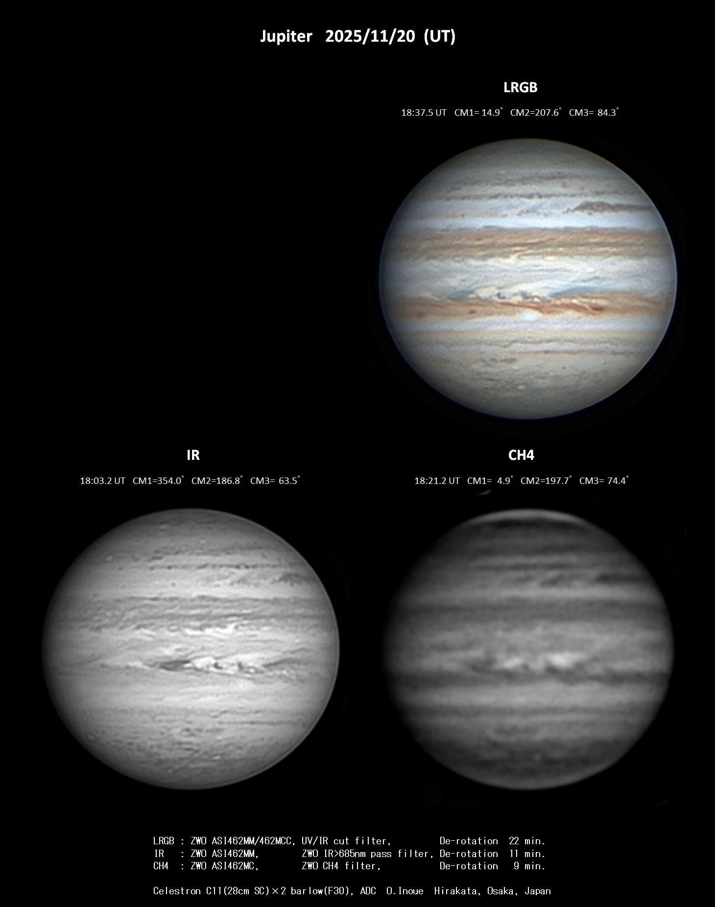 良く晴れましたが、最初に撮ったLRGBはシーイングボロボロでボツにしました。その後はかなり良くなって、IR,CH4,LRGBの順で撮りました