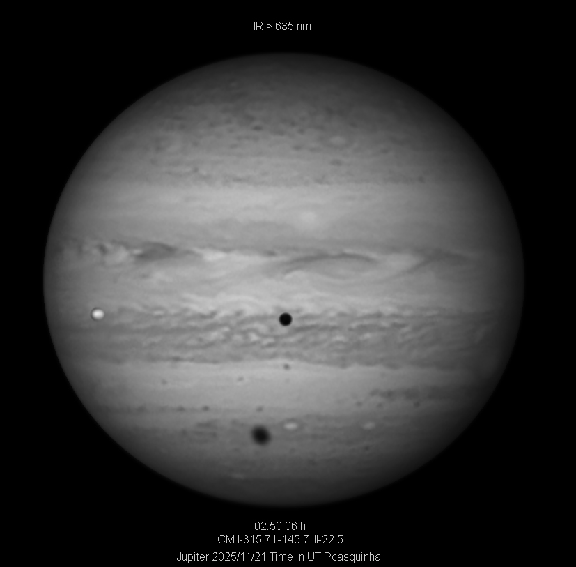 Jupiter on the night of the 21st with a double transit of the shadows of Io and Callisto, with Io also over the planet.