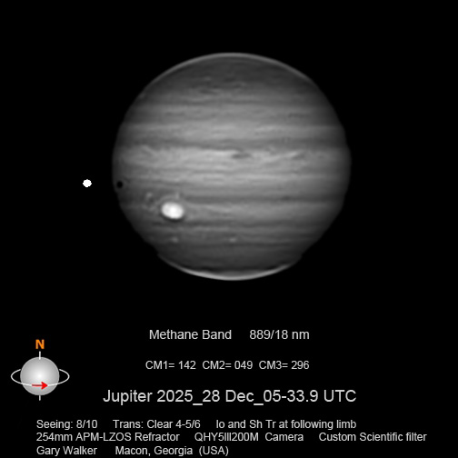 衛星Europaの影と本体が見えていますが本体の明るさは縞模様と同じ程度なのでカラーでは難しい