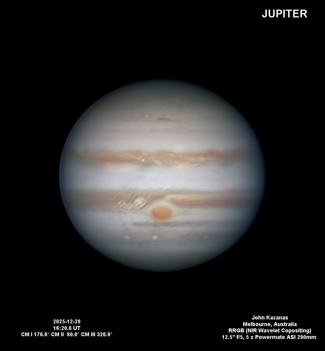 A RRGB image of Jupiter using Wavelet Compositing for better detail of Jupiter showing the evolving disturbance near the GRS