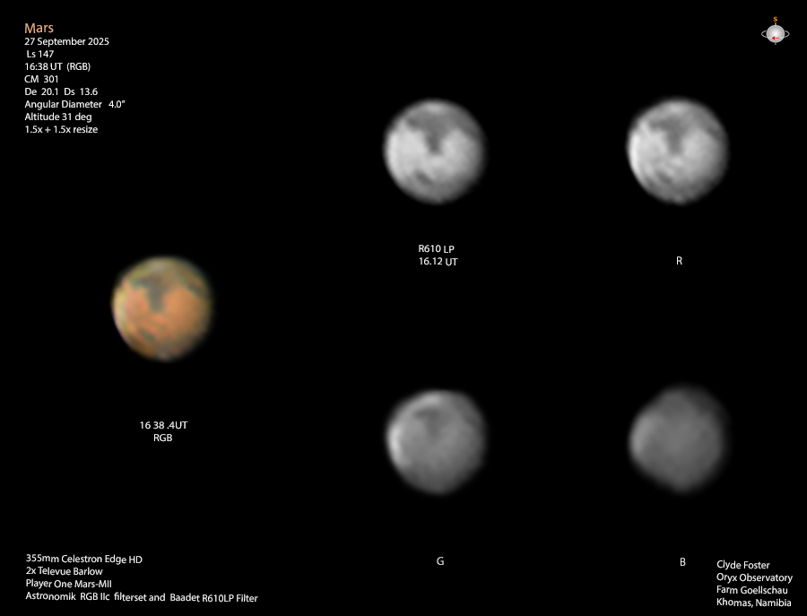 The RLP and R came out surprisingly well, with Syrtis Major extending up from centre. The B remains challenging. Boreosyrtis is evident lower left of centre, with Syrtis Minor at upper left.