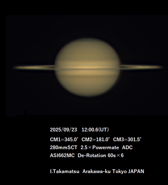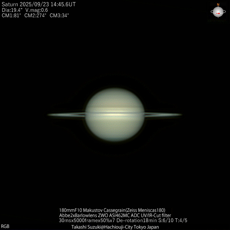 薄雲空の悪条件ですが土星環の本体の影がほとんど見えません。悪気流、イメージは悪いけど45p反射の光軸は良く合ってきました。