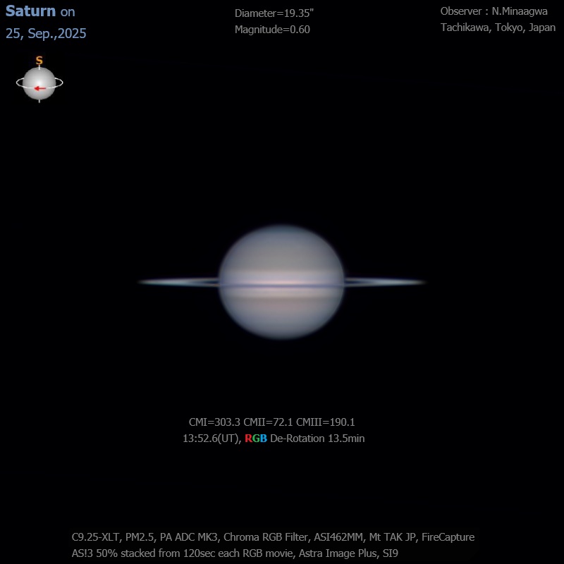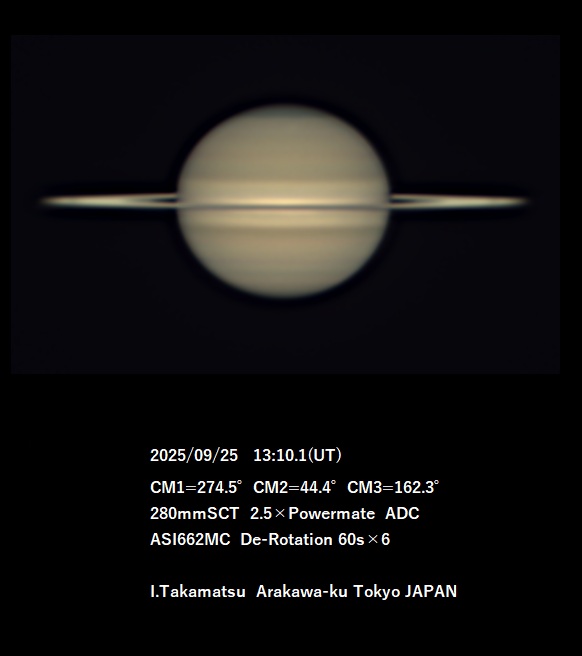 環が細くなってきて明るくなり、眼視では串団子のようです。気流が良く、カラーとIRの南半球に白斑があります。(矢印)