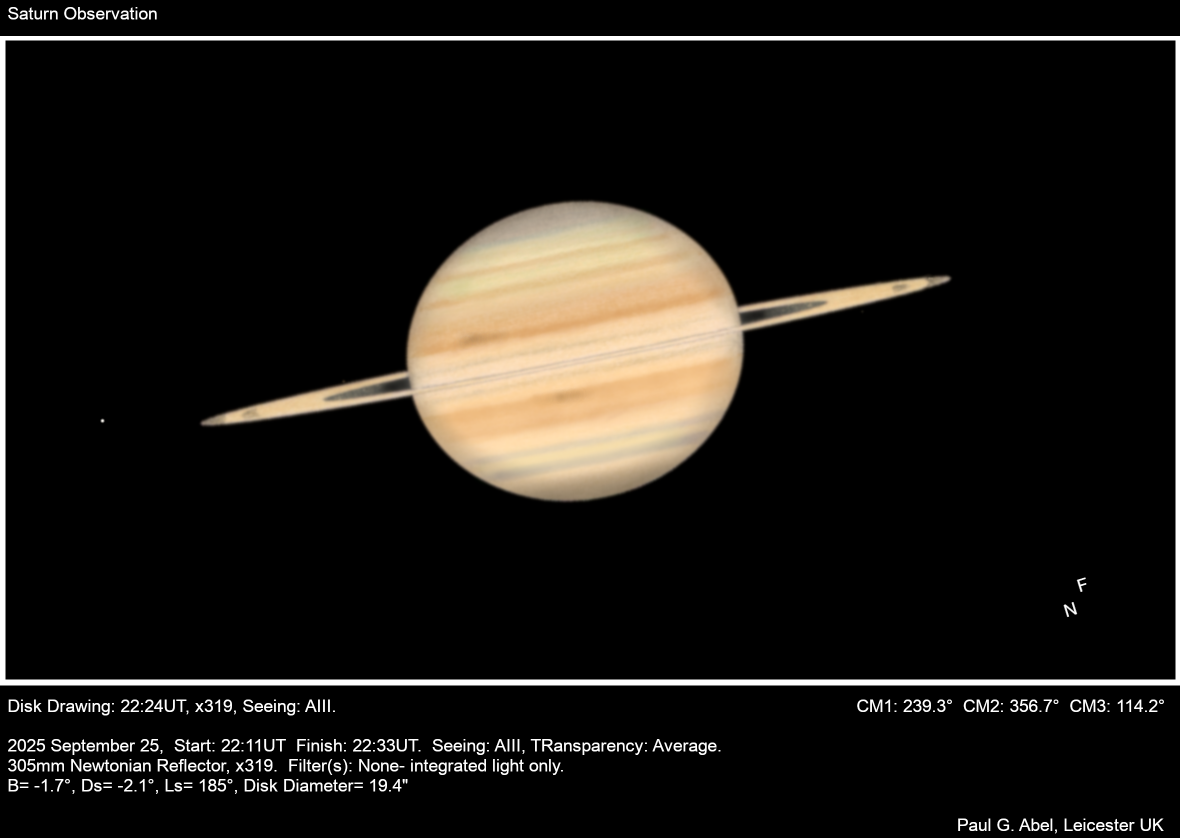 The satellite Tethys is shown close to the rings in the drawing. Observations of Saturn concluded at 22:33UT.