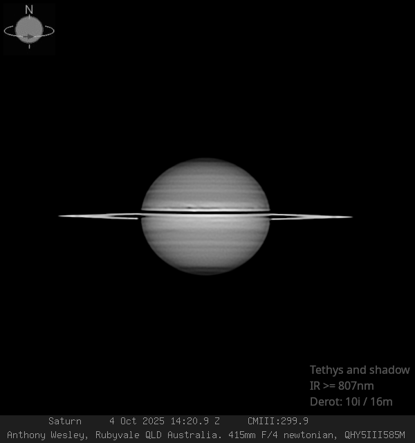 taken in reasonable seeing. The IR807 longpass image has been more heavily processed to highlight the faint cloud structure visible just above and below the equator. Tethys is in transit, it's shadow can be seen on the left just above the ring shadow.