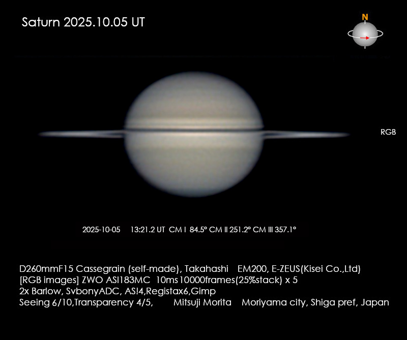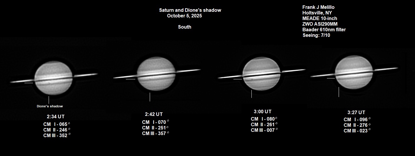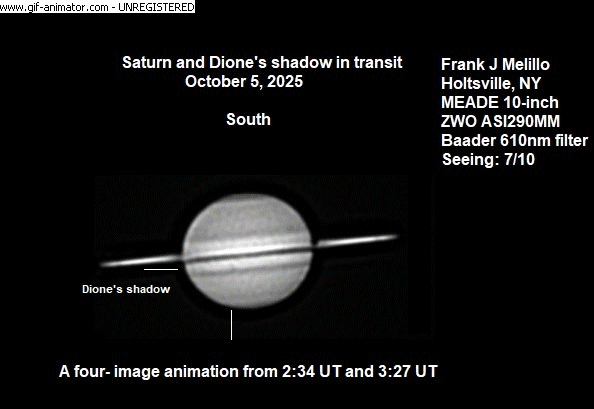 I have captured Dione's shadow transit on Saturn's disk October 5, 2025 from 2:34 UT and 3:27 UT. Plus a four-image animation.