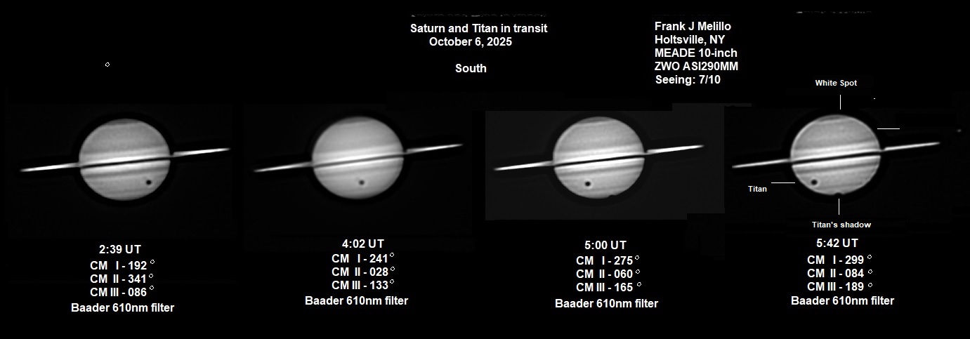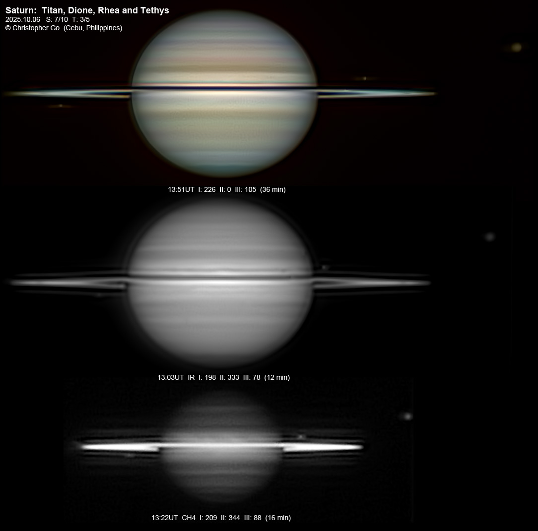 Here is an image of Saturn with 4 moons! Titan is on the far right. Unfortunately,the Titan transits were not visible in my region this year. Rhea is on the upper right. Dione is on the lower left. Tethys can be seen as a bright spot on the ring on the right. On the IR image,one can see the shadows of Tethys and Rhea on the right.