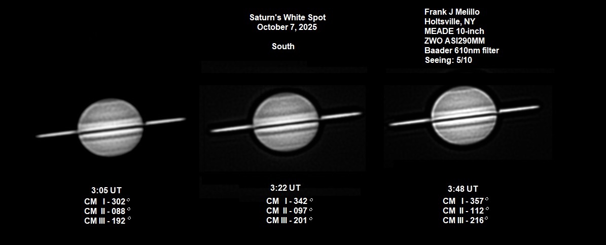Saturn's White Spot in the southern hemisphere on October 7, 2025 from 3:05 UT to 3:48 UT.[Frank J Melillo Holtsville NY U.S.A]