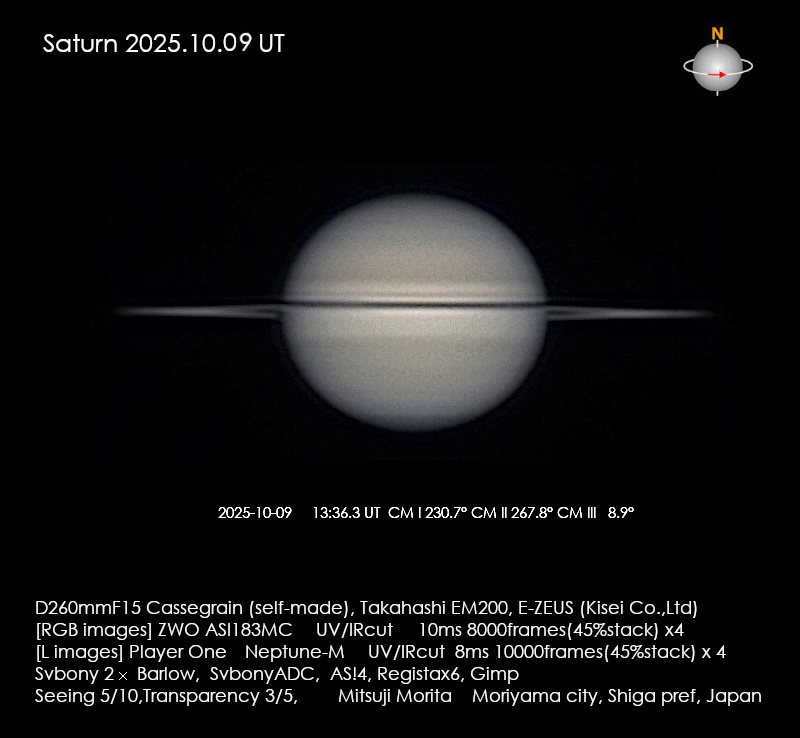 Tethys is visible to the left of the ring. 12 images captures over 30 minutes were combined to get this result.