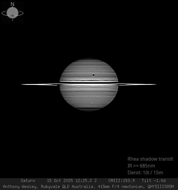 Rhea and it's shadow are present,although Rhea itself is very difficult to spot close to the equator.