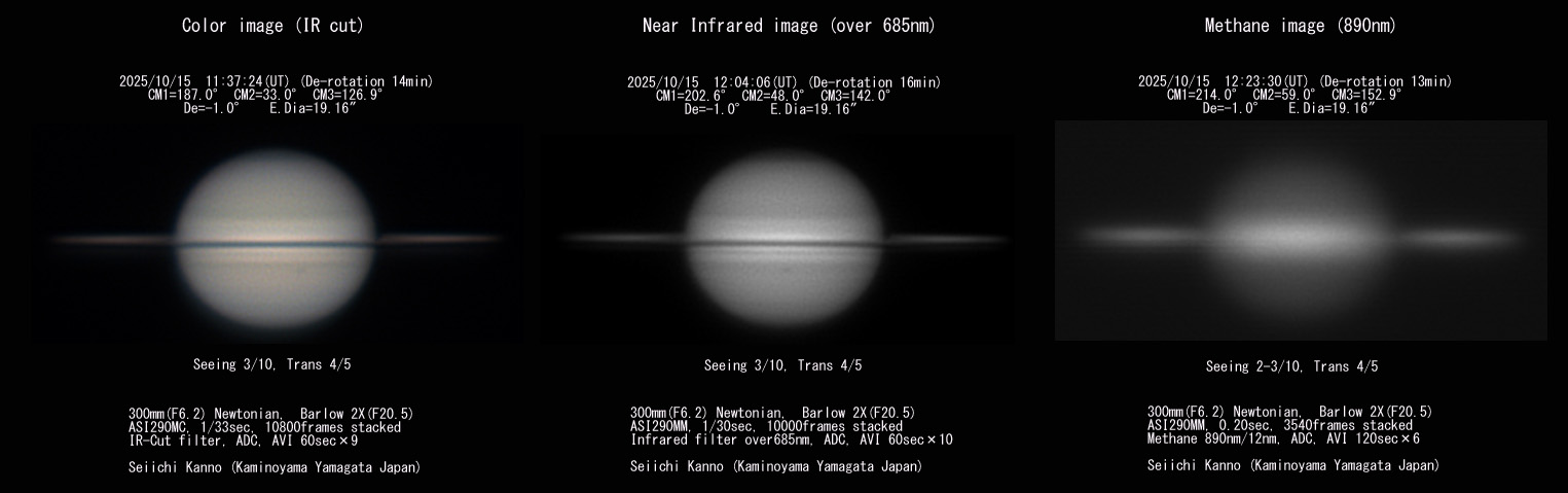 やはりシーイングは良くなく土星は揺れ動き、ピントもうまく定まらず変化していますが、数打てば当たる方式で撮像してみました。カラー画像と近赤外画像は、衛星レアの本体と影が微かに確認出来そうな感じですが、メタンバンドはただの光の塊にしかなりませんでした。