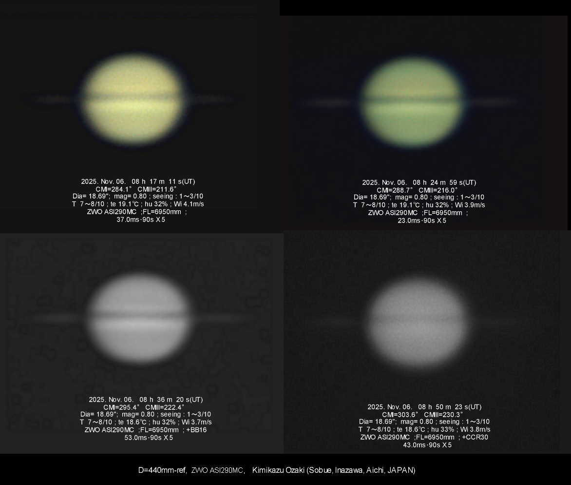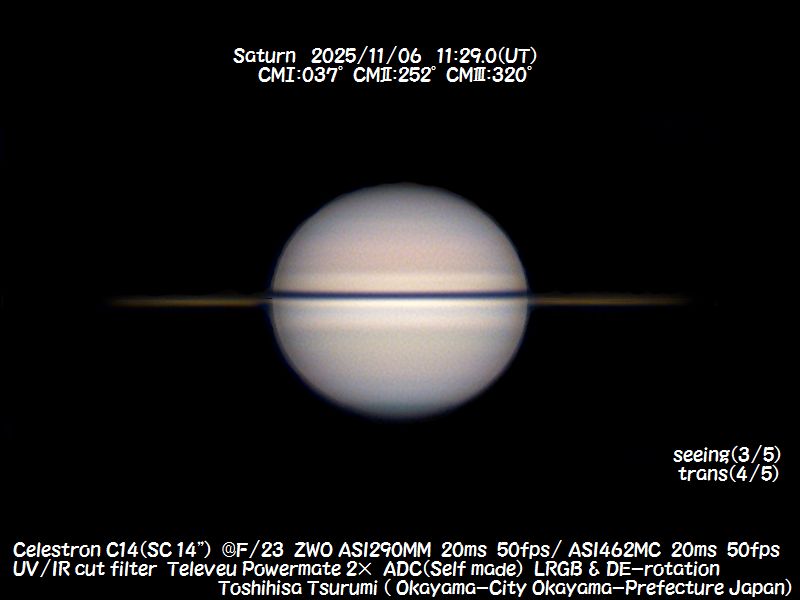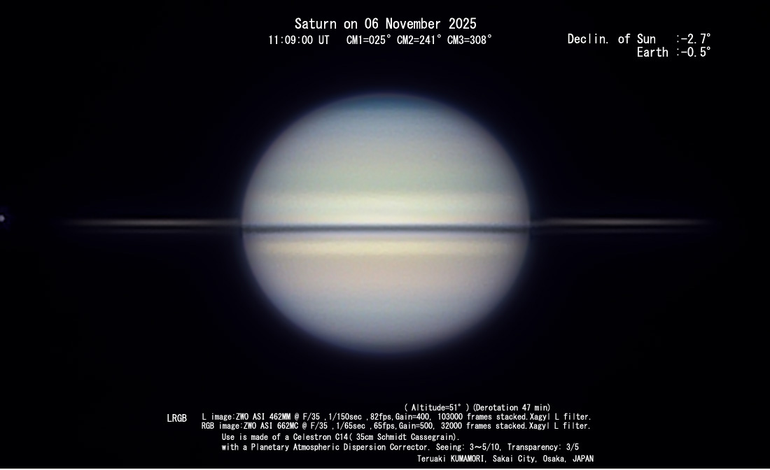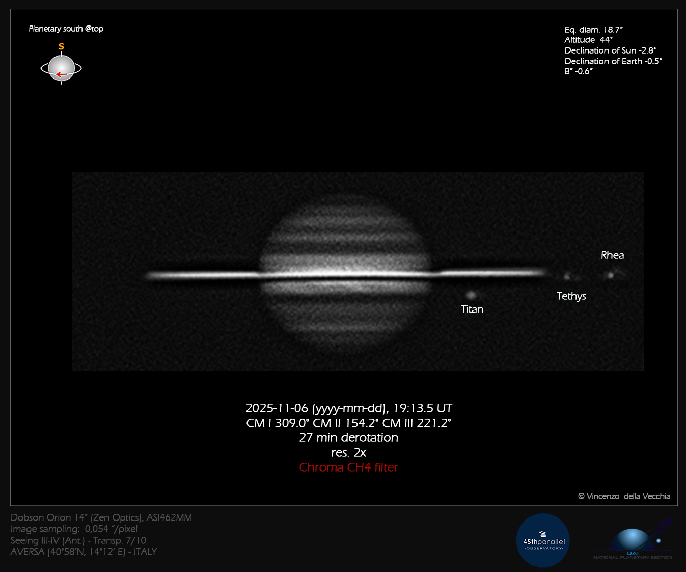The Rings: These are very narrow now but there is a faint dark patch in the rings which indicate the Cassini Division. The rings appear to be of uniform thickness and I observed no condensations along the ansae.