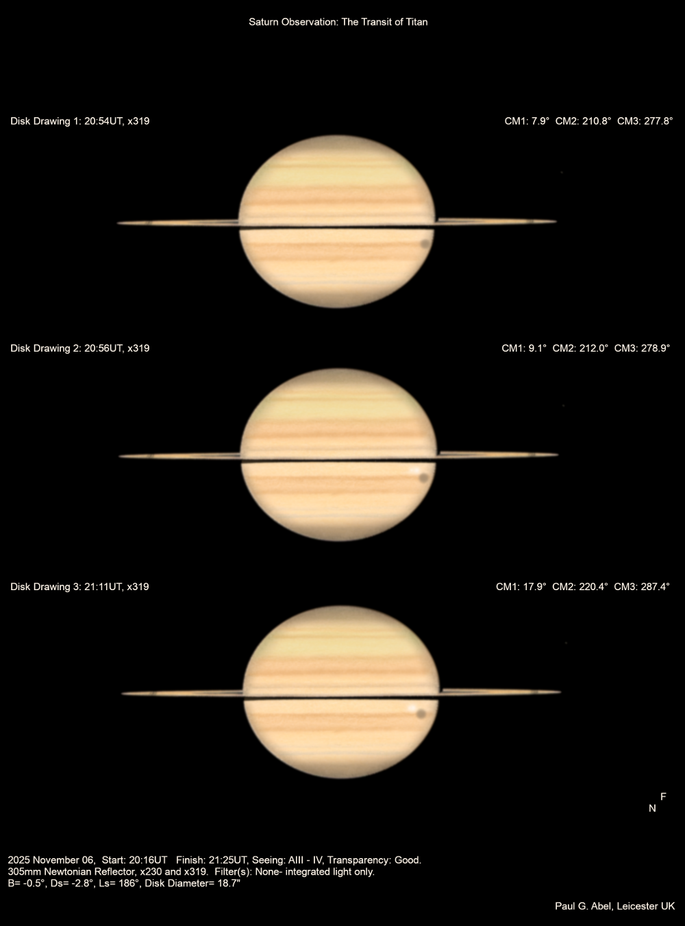 After 30 years of amateur astronomy I finally managed to see a transit of Titan. Conditions were not good, there was frequent passing cloud and seeing was only average at best. Nevertheless, I was able to see Titan pass on to the disk. One thing I did notice, just to the left of Titan there seemed to be a bright spot (see drawings 2 and 3). Rhea was in transit but much further away so I'm unsure if this was a contrast effect or a real bright spot in the EZ. Also:
