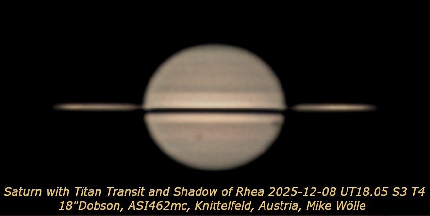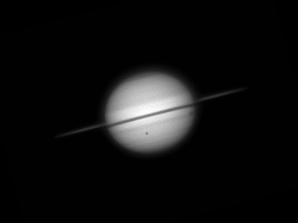 Rhea's shadow, Titan transits on the disc Enceladus near to be overlapped by ring processing.