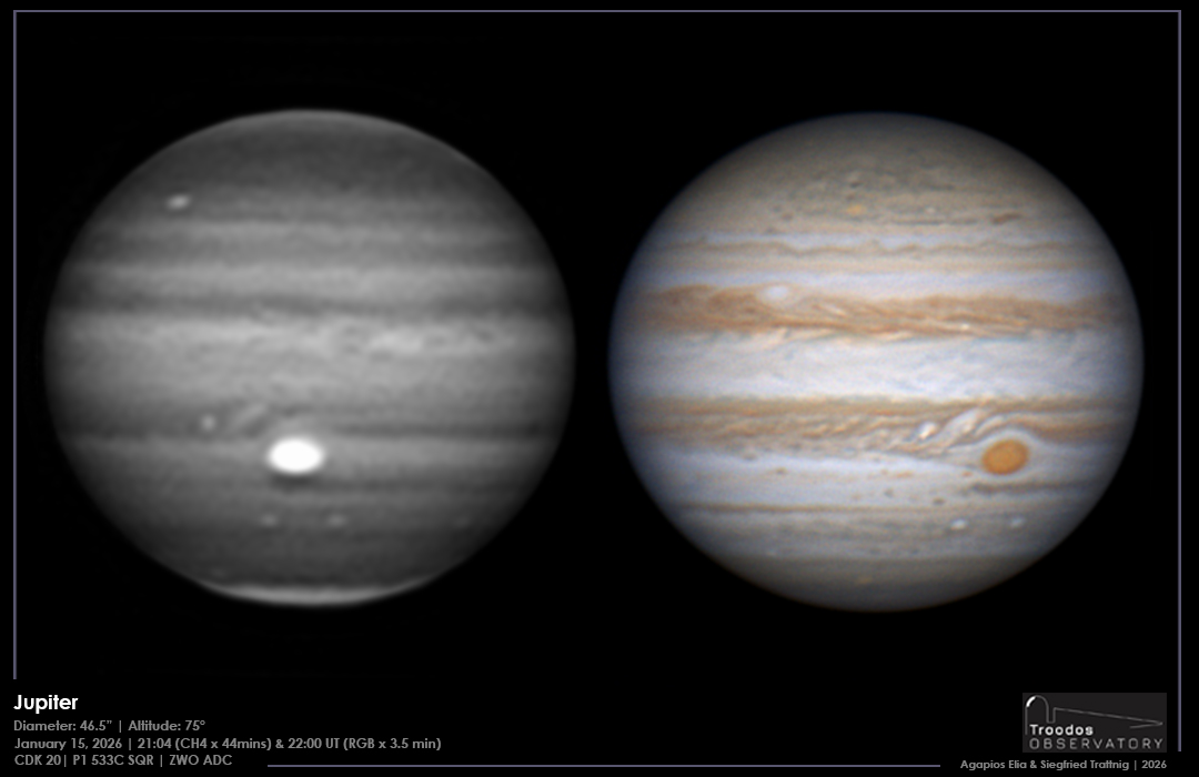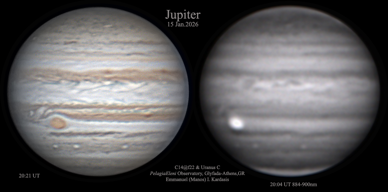 大赤斑が左端で暗い縁取りに囲まれた明るいオレンジ色に見えていました。