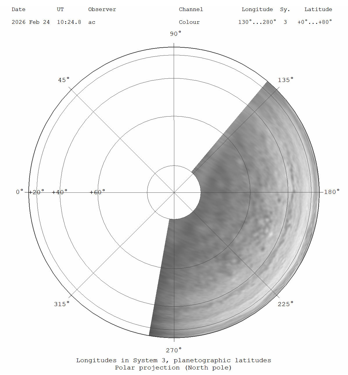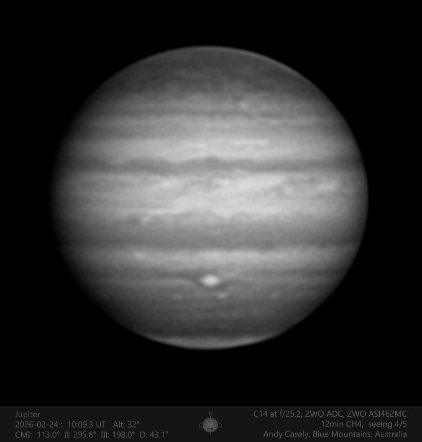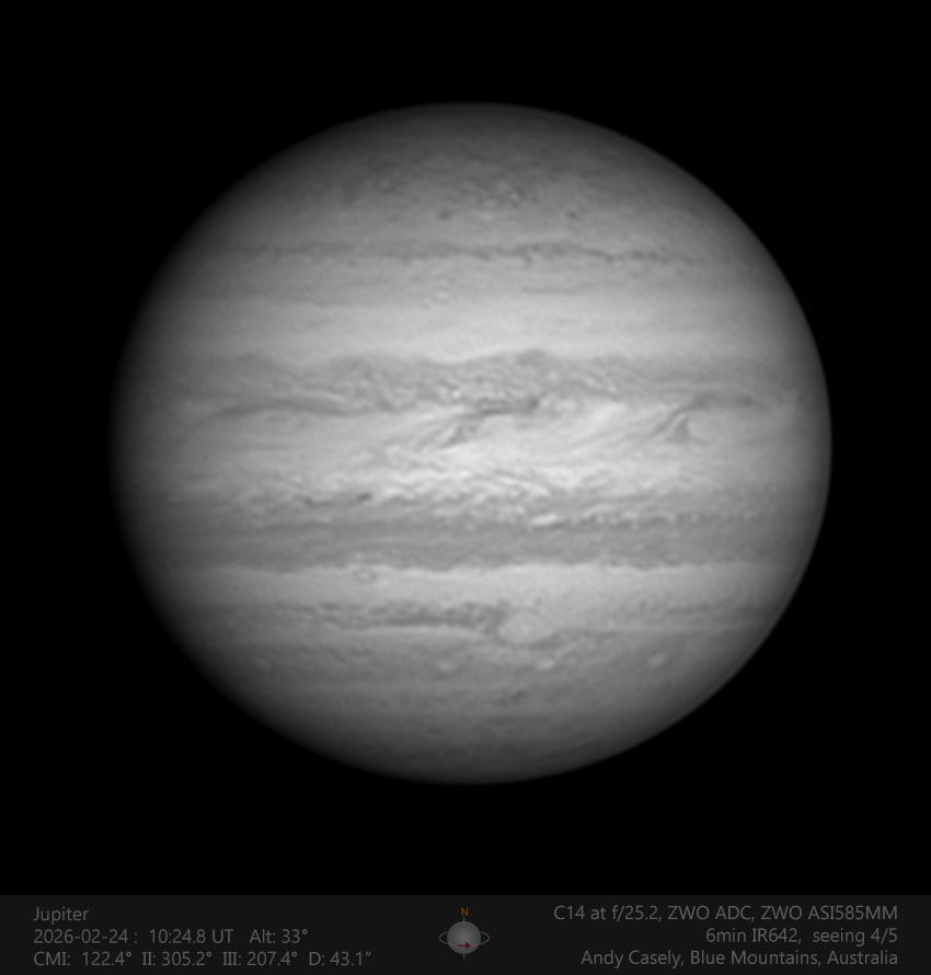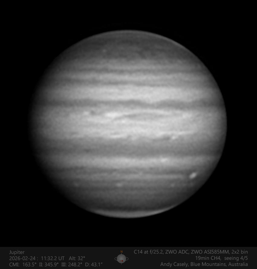 ere's a nice image set from Tuesday in good seeing, with Oval BA in view, and hopefully just a little helpful for the various professional observing campaigns too. Quite a lot of detail in the two methane images and in IR, even towards higher latitudes, with a couple of northern FFRs appearing in IR. The ring on the STrZ is resolved in IR, and appears as a bright spot in methane. I've added maps for the IR and methane data. The second methane image was with the 585MM and 2x binning, which worked quite well in relation to my usual 462MC methane imaging. I also played around with the preprocessing blur feature in Autostakkert which definitely helped the image selection and alignment and measurably improving the stacked output for the images, particularly the methane. These are probably close to my limit with low altitude and summer seeing, they were my best and most enjoyable Jupiter data for a couple of years. Bring on higher altitude again! Clear skies all![]()