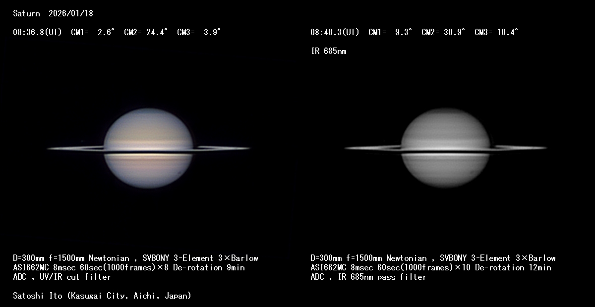 夕方透明度が良かったので西空の土星を撮像。開きつつある環が良く分かる。衛星Rheaとその影が見えています。 気流が不安定だったので口径を30pに絞りましたたが、効果はあった様です。≪Cebu PHILLIPINES 阿久津富夫≫