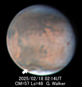 もうひとつは2月18日に発生したMare Acidarium(20〜45W, +40〜55)北部の細いダストストームのバンドです。 ここは北半球最大の暗部で、ダストストームや白雲が盛んに出る場所です。 風の影響を受けて発生したようです。 翌日には南側の光点(これもダストストーム)と一緒になり、南側に幅が広がりました。 この時期にしては、比較的大きな変化です。