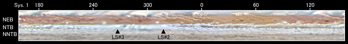 LS#2後方のI=0〜180°では、北温帯縞(NTB)が濃く幅のあるベルトとして復活しています。 その後方は北へ下がってNTB北組織(NTBn)に変化しながら、LS#3の北を通り、木星面を一周しています。