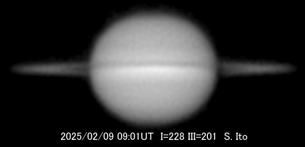 土星2月9日の伊藤了史氏(愛知県)の画像が、今シーズン最後の観測となりました。 合明け直後の3月24日には地球が環の平面を横切って南側へ移るので、これは環の北側を捉えた最後の観測です。 次に環の北側が見えるのは、13年後の2038年となります。