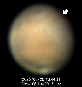 火星の季節を表す指標であるLsは、およそ100°になりました。 北半球は夏至を過ぎたところです。 遠日点を過ぎて間もない火星は、雲のシーズンの真っただ中にあり、今シーズンの終わりまで続きます。 図1は伊藤了史氏(愛知県)による6月20日の火星で、広がった雲の中にTharsisの火山列が捉えられています。 普段のTharsis付近は地表の暗い模様が見えにくい経度ですが、これからはしばらくは暗い模様が見える時期になります。