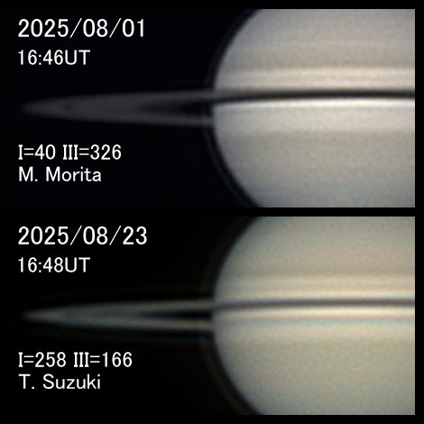 土星本体では小白斑などが度々捉えられています。 南緯50°付近で今月8回観測された拡散した白斑は、6月〜7月初に観測された白斑の延長上にあり、1日あたり-12°という高速で前進しています。 白斑が復活したようです。