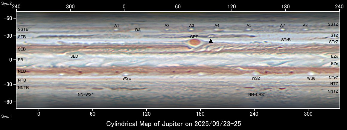 幅広い北赤道縞(NEB)は北部が部分的に淡化を始めて、II=200°前後ではベルトが細く見えるようになりました。 北熱帯(NTrZ)から淡化が進む北温帯縞(NTB)南組織にかけて、大小5つの暗斑が観測されています。 これらは体系Iと同程度のスピードを持っていて、今年1月に発生したNTBs jetstream outbreakの名残と思われます。