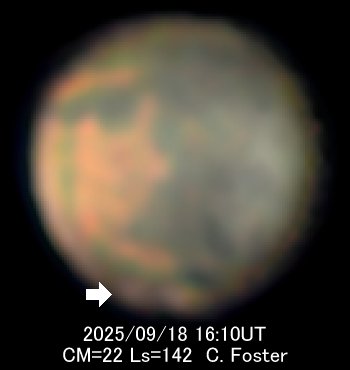 9月18日にナミビアのクライド・フォスター(Clyde Foster)氏が、北極冠の近くにローカルダストストームを記録しました。 この時期はよく似た姿の低気圧が極冠の近くにできるのですが、他色の観測があったため、ダストストームと判断できました。 おそらく今シーズン最後となるでしょう。